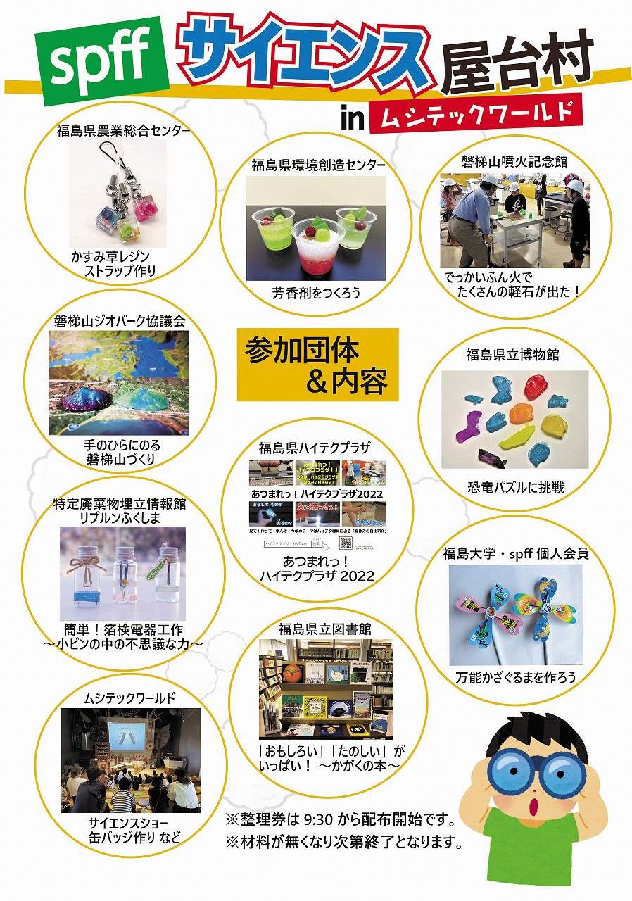 県内の科学館・博物館・図書館・研究機関・大学などが連携協力して「spffサイエンス屋台村」をムシテックワールドで開催します。